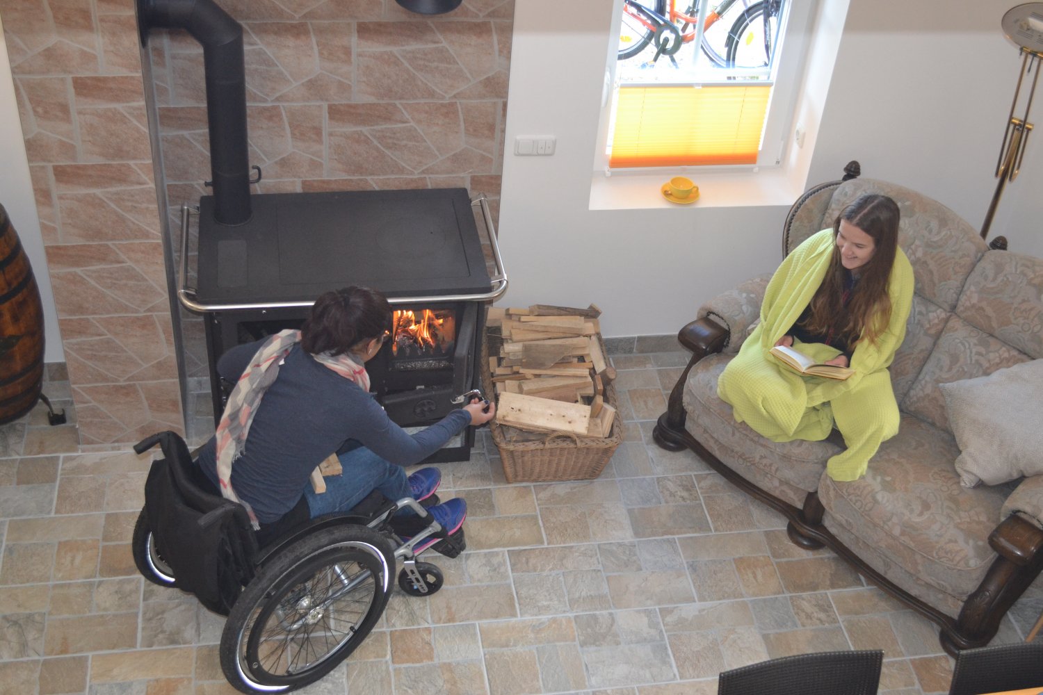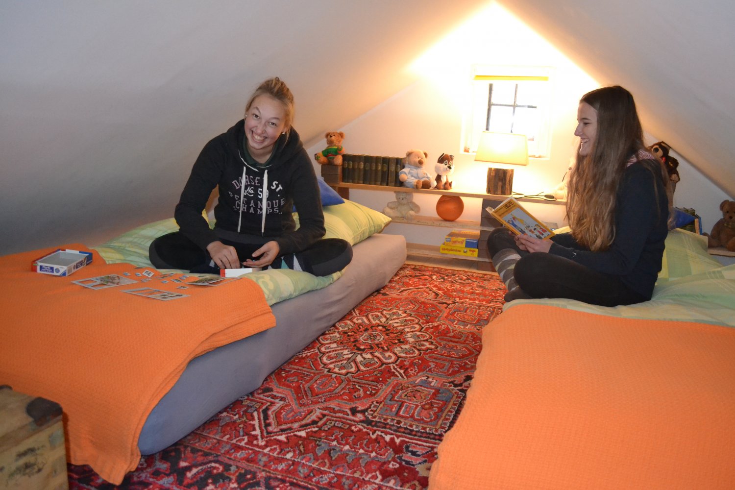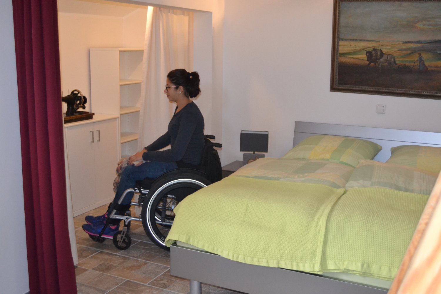 Unsere Otto-Wohnung, die charmante Dachwohnung im Lisahaus, ist nur über eine Treppe erreichbar und somit nicht rollstuhlgängig. Sie verfügt über eine kleine Küchenzeile, ein kleines Badezimmer mit Dusche und WC sowie zwei Schlafzimmer.
